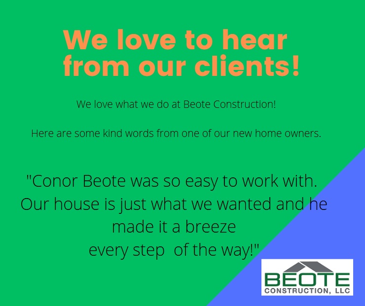 We are committed to our employees, contractors and customers. We promise to be honest, ethical and hard working to deliver a high quality product in a timely manner. Learn More about having your home built by Beote Construction.